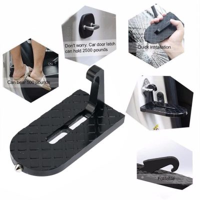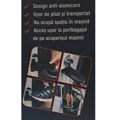 Treapta este ideala pentru acces rapid si sigur la plafonul masinii. Fabricata din aliaj de aluminiu rezistent, suporta pana la 120 kg si se monteaza usor pe carligul de inchidere al usii, fara a deteriora caroseria datorita protectiilor din cauciuc.